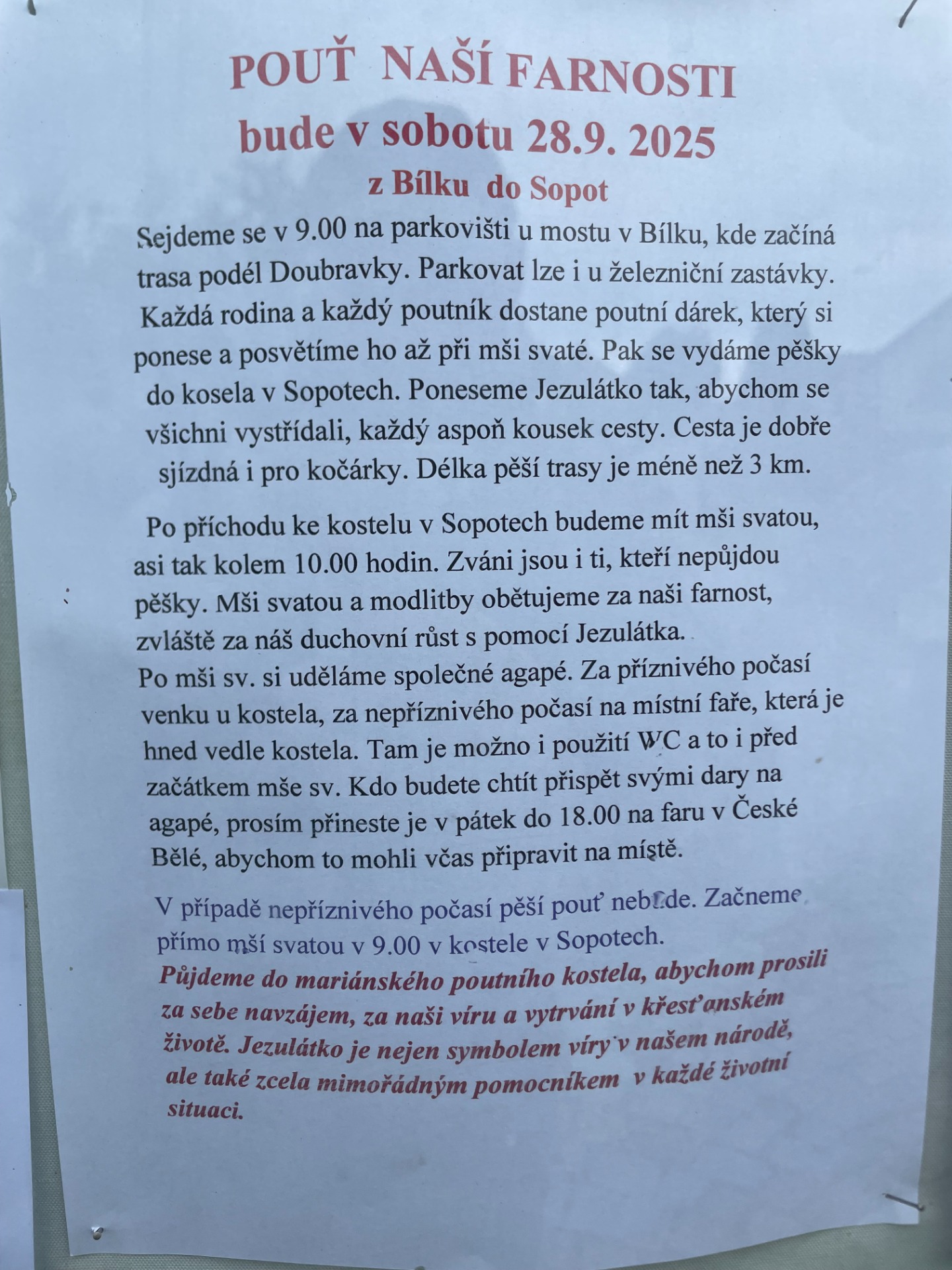 V případě nepříznivého počasí pěší pouť nebude. Začneme přímo mší svatou v 9:00 v kostele v Dolní Krupé. Korouhve a mašle přesto vzít s sebou.